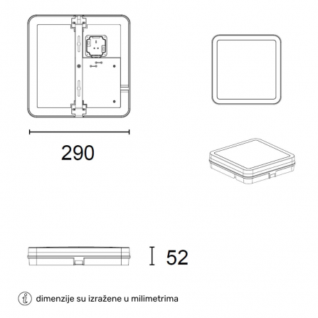 Snaga od 18W i svetlosni fluks od 1850 lm obezbeđuju jasno i ravnomerno svetlo, dok SMD2835 LED diode i IC driver garantuju stabilan rad. Dimenzije su 220×220×55 mm, sa PP kućištem i ugrađenim difuzorom.