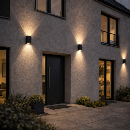 Spoljna zidna svetiljka, tamno sive boje, IP65 zaštita. Poseduje 2 sijalična grla, tip GU10. Elegantnog dizajna, izrađena je u obliku kvadra, od aluminijuma sa odličnom završnom obradom. Idealna je za postavljanje na fasade stambenih i industrijskih objekata, na terasama i u dvorištima.