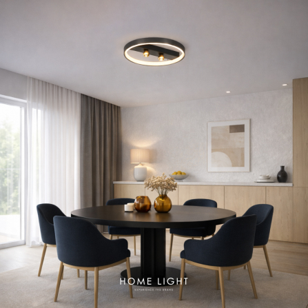 Led luster, sivo zlatne boje i toplo bele boje svetla. Osvetljenje snage 40W daje iz tri kugle, abažura koji su postavljeni na gornjem delu kružne linije rasvete, kao i na dole celom dužinom obima konstrukcije. Ovo je model rasvete koji svojim izgledom privlači pažnju i postaje centralni fokus modernih enterijera.
